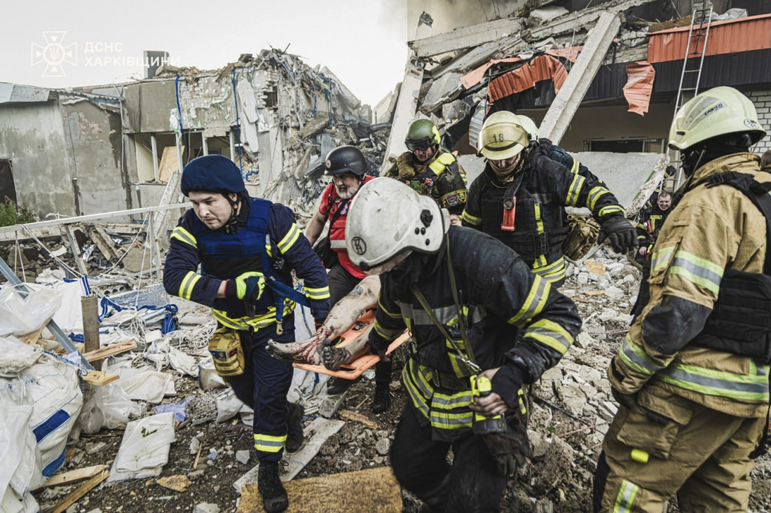 10일(현지시간) 우크라이나 하르키우에서 러시아 로켓 공격으로 희생된 시신을 응급 서비스 요원들이 옮기고 있다. AP연합뉴스 |