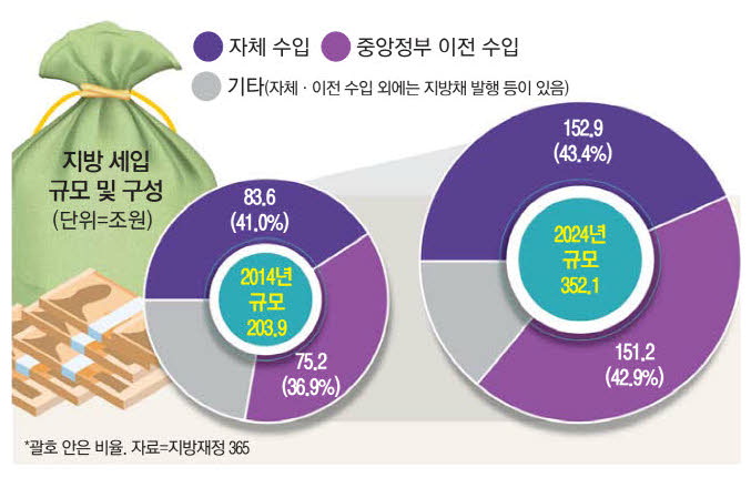 한편 이 대통령의 '지방' 중시는 단순히 2차 추경을 통한 상권 지원에만 머물지 않는다. 유력한 방안으로는 지방 이전 수입의 절반가량을 차지하는 지방교부세 확대가 거론된다. 현재 내국세의 19.24%가 지방교부세로 이전되고 있는데, 이 비율을 더욱 끌어올리는 방향이 중심축이 될 것으로 보인다. 지방 이전 재원은 빠른 속도로 증가해 왔다. 한국지방세연구원에 따르면 2014년 75조2000억원 수준이던 이전 수입은 지난해 151조2000억원으로 10년 새 두 배 가까이 늘었고, 지방 세입 내 비중도 36.9%에서 42.9%로 상승했다.