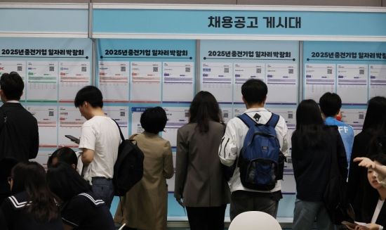 23일 서울 강남구 코엑스에서 열린 2025년 중견기업 일자리 박람회를 찾은 많은 구직자들이 채용공고 게시판을 살펴보고 있다. 2025.4.23 조용준 기자 |