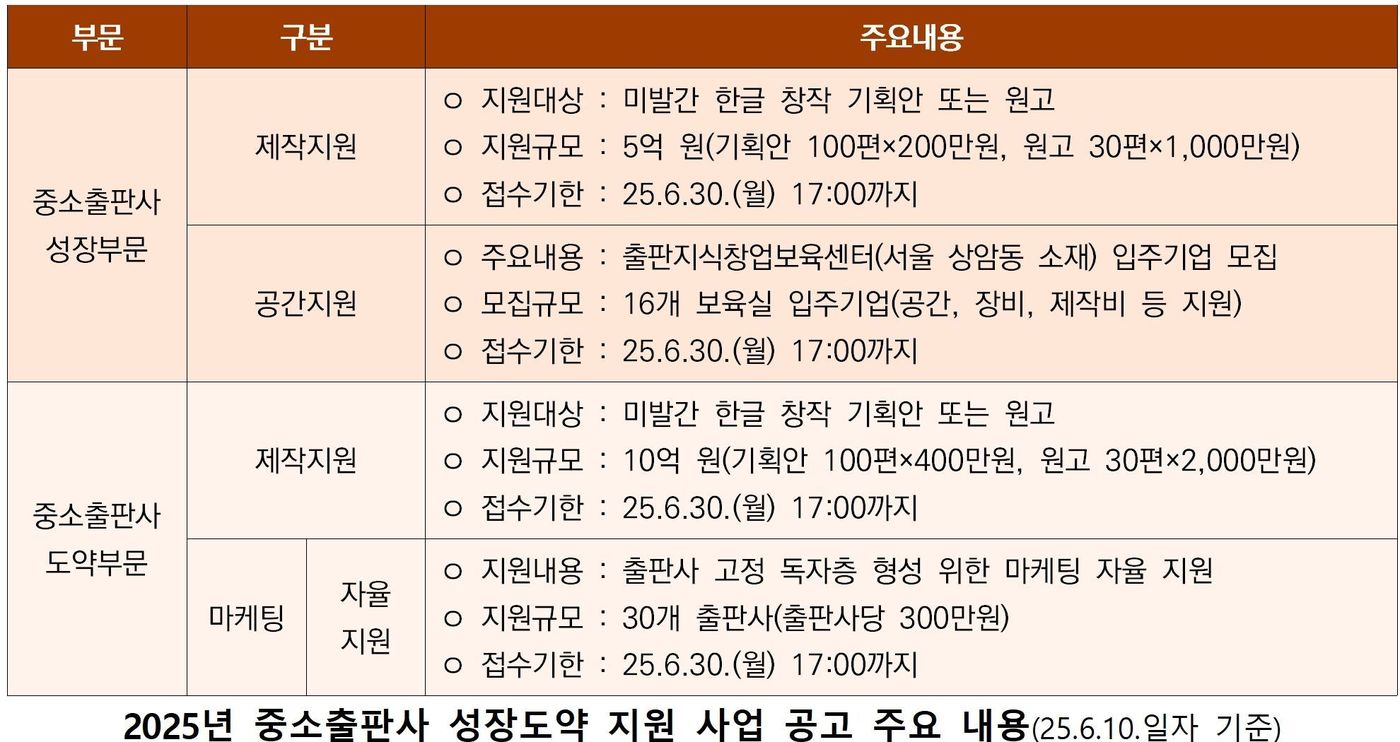 성장 부문에서 제작지원은 미발간 한글 창작 기획안 또는 원고를 제출하면 된다. 공간지원은 출판지식창업보육센터(서울 상암동 소재) 입주할 기업을 모집한다.