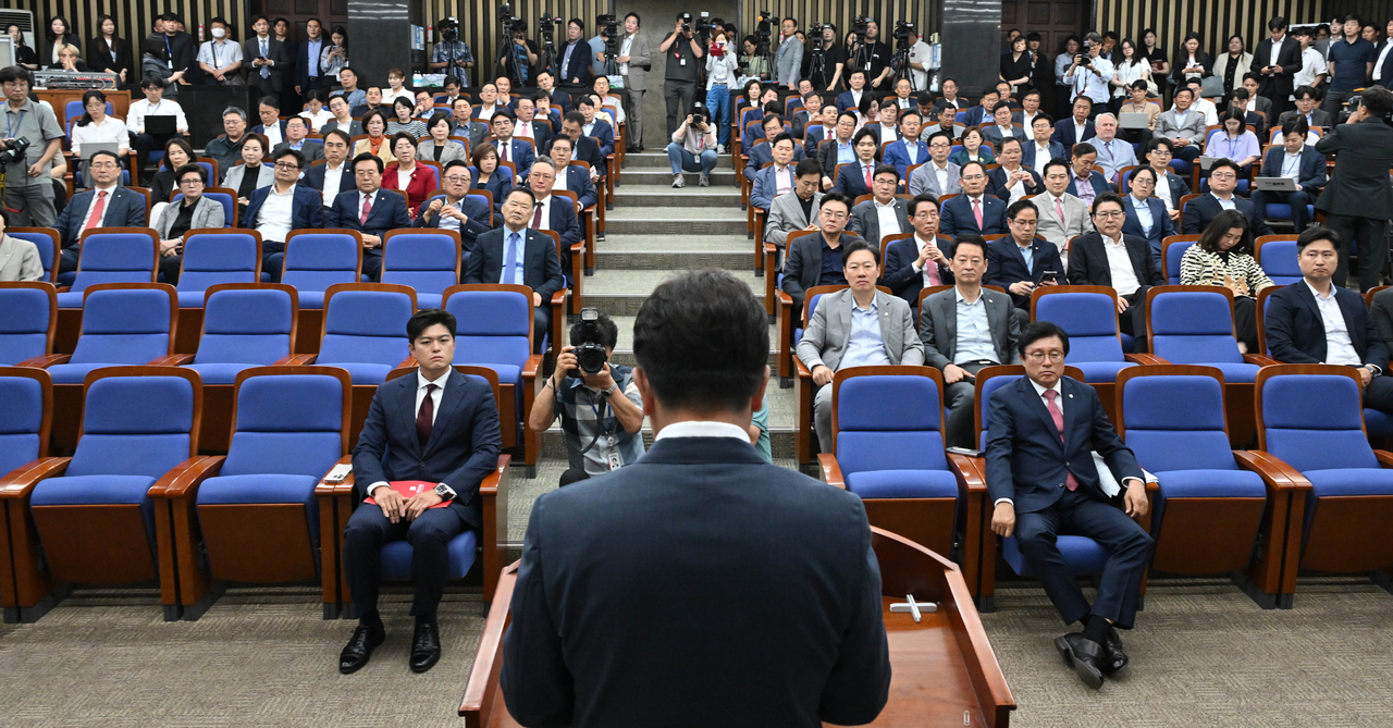 9일 오후 서울 여의도 국회에서 진행된 국민의힘 의원총회. [사진=임세준 기자] |
