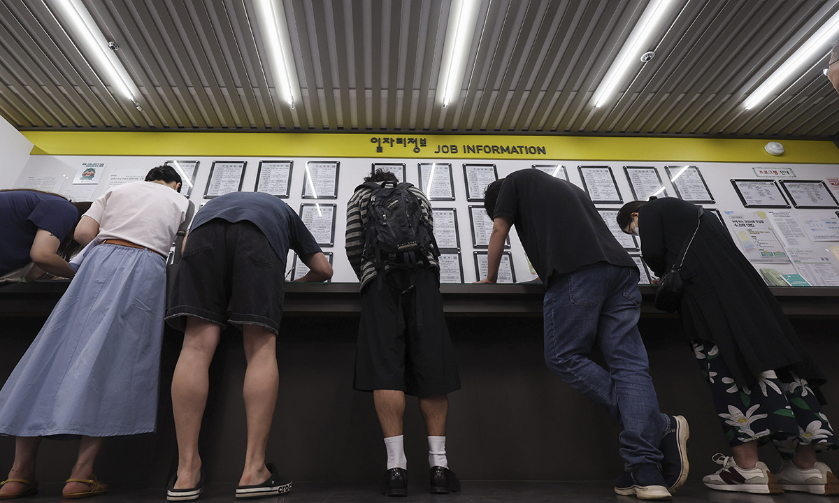 11일 서울 마포구 서부고용복지플러스센터 일자리 게시판 앞에서 구직자들이 이력서를 작성하고 있다. 뉴시스 |