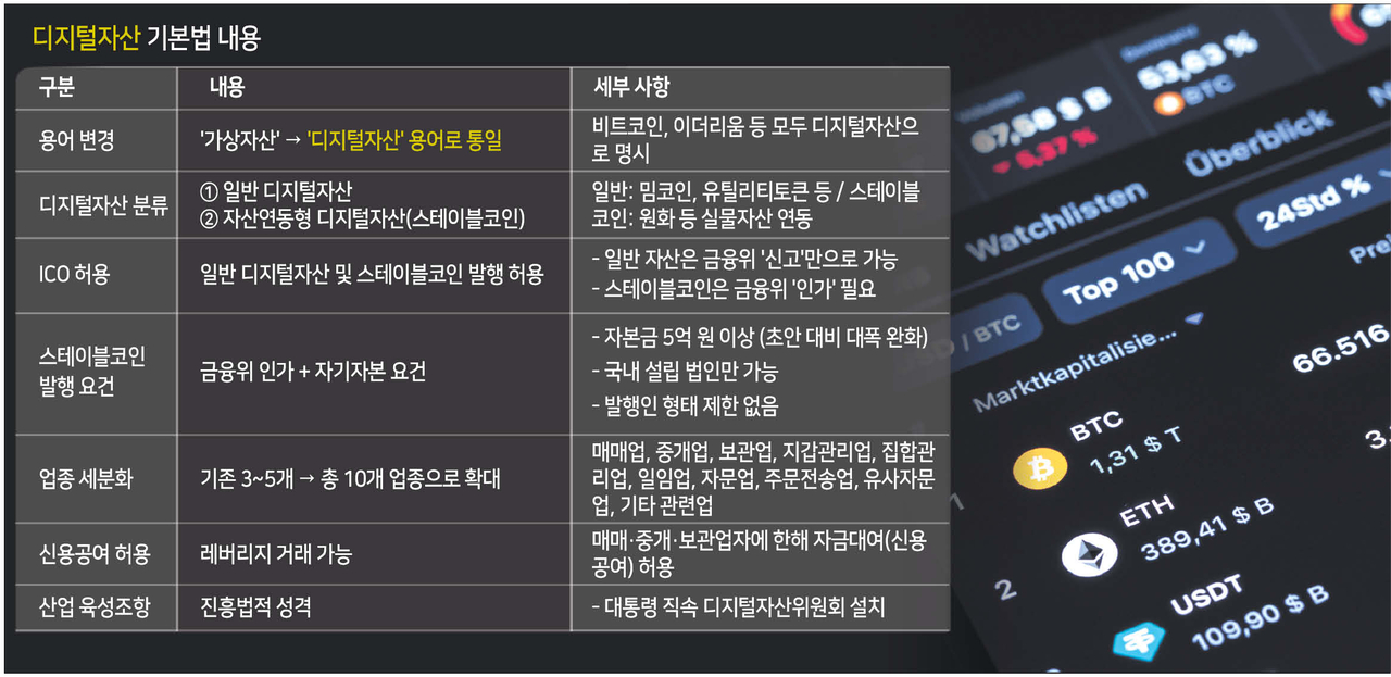 업권은 기존 5개에서 10개 유형으로 세분화됐다. 또한 대통령 직속 디지털자산위원회를 설치해 산업 진흥 기본계획을 수립하고 시장 실태조사 등을 추진하도록 했다.