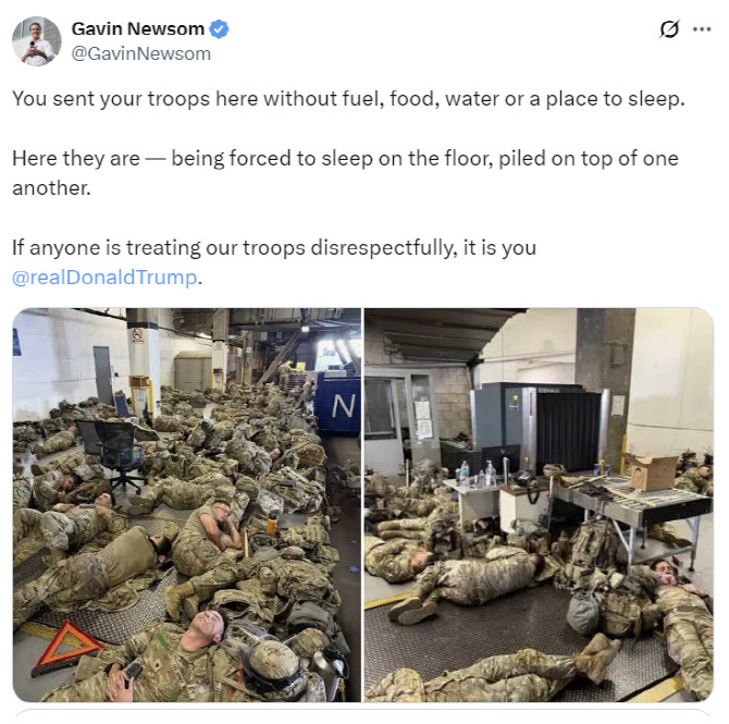 미국 소셜미디어(SNS)에서 허위정보 및 가짜뉴스가 범람하면서, 개빈 뉴섬 캘리포니아 주지사가 도널드 트럼프 미국 대통령에게 “당신은 연료, 식량, 물, 잠자리도 없이 군대를 이곳에 보냈다”며 공유한 사진도 조작 논란에 휩싸였다. (사진=뉴섬 X 캡쳐) |