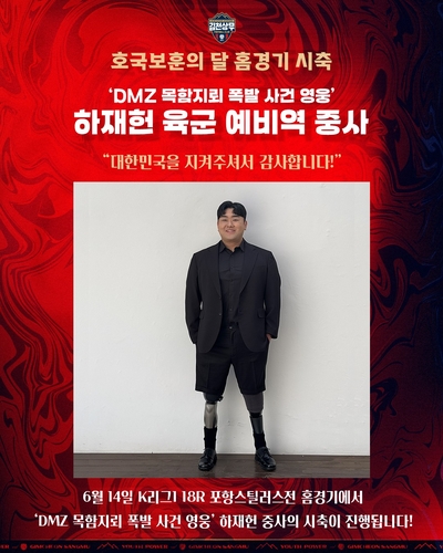 (서울=연합뉴스) 이영호 기자 = 프로축구 K리그1 김천 상무가 호국보훈의 달을 맞아 오는 14일 포항 스틸러스와 하나은행 K리그1 2025 18라운드 시축자로 비무장지대(DMZ) 목함 지뢰 폭발 사고로 두 다리를 잃은 하재헌 육군 예비역 중사를 초청했다고 11일 밝혔다.
