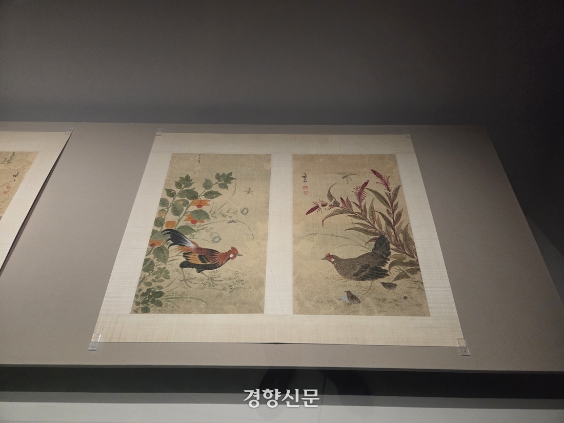 대구간송미술관에서 열리는 특별전 ‘화조미감’에 전시 중인 겸재 정선의 <화훼영모화첩> 중 ‘등롱웅계’(왼쪽)와 ‘계관만추’. 대구 | 윤승민 기자 |