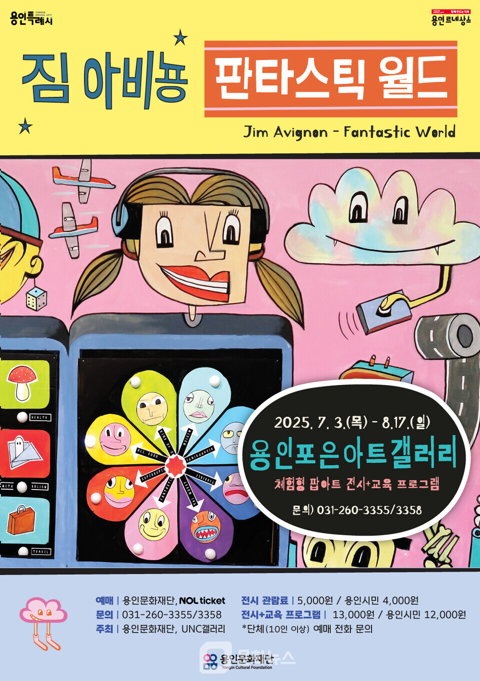 (문화뉴스 이용훈 기자) 용인문화재단이 운영하는 용인포은아트갤러리가 여름방학 시즌을 맞아 온 가족이 함께 즐길 수 있는 체험형 팝아트 전시 《짐 아비뇽: 판타스틱 월드(Jim Avignon: Fantastic World)》를 오는 7월 3일부터 8월 17일까지 선보인다.