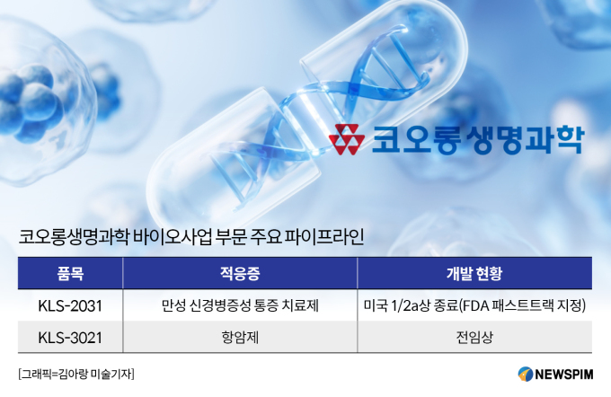 주요 파이프라인으로는 만성 신경병증성 통증 치료제 'KLS-2031'이 있다. 해당 파이프라인의 적응증은 요천골 신경근병증에 의한 신경병증성 통증으로 뇌에 전달되는 과도한 통증 신호를 차단하는 기전을 지녔다. 신경 세포 보호와 염증 해결을 통해 활성화된 통증 환경을 개선하는 다중 타겟 치료제다.