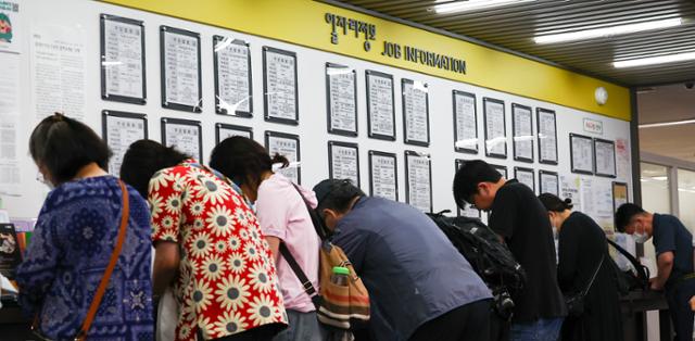 11일 서울 마포구 서부고용복지플러스센터 일자리 게시판 앞에서 구직자들이 이력서를 작성하고 있다. 뉴시스 |