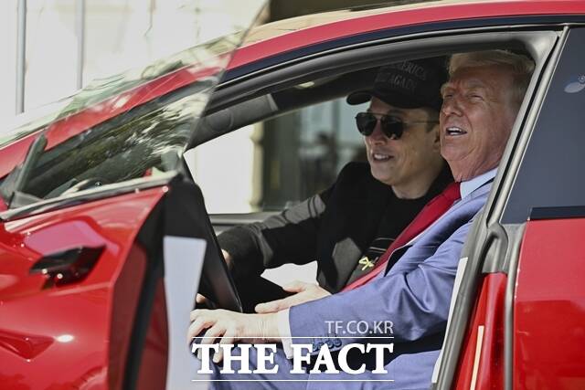 일론 머스크가 SNS를 통해 도널드 트럼프 미국 대통령에게 공개 사과했다. 사진은 지난 3월 도널드 트럼프 미국 대통령과 일론 머스크 테슬라 최고경영자가 테슬라 모델S에 앉아 기자들과 대화하고 있는 모습 /AP. 뉴시스 |