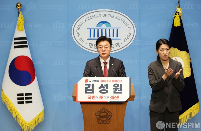 [서울=뉴스핌] 김학선 기자 = 김성원 국민의힘 의원이 12일 오전 국회 소통관에서 원내대표 출마 선언 기자회견을 하고 있다. 2025.06.12 yooksa@newspim.com