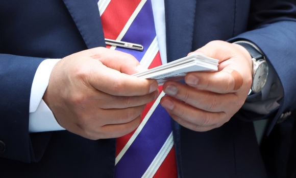 이재명 대통령이 11일 서울 용산 대통령실 기자식당에서 출입기자들과 점심식사 후 받은 명함을 손에 들고 있다. 2025.6.11 연합뉴스 |