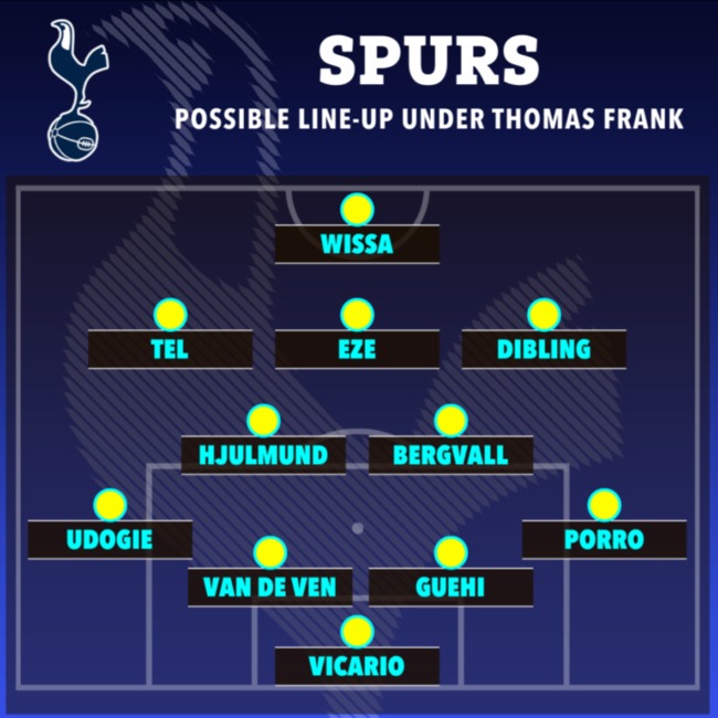 프랭크 감독이 다음 주면 공식적으로 토트넘 감독이 될 것으로 보이는데 이에 따라 여름 이적시장 영입도 진행될 것이다. 영국 '더 선'은 토트넘이 프랭크 감독 아래에서 꾸릴 수 있는 베스트 일레븐을 예상했다. 최전방에는 브렌트포드 소속 요안 위사였고 그 밑을 마티스 텔, 에베레치 에제, 타일러 디블링이 받쳤다. 3선은 모르텐 히울만, 루카스 베리발이었고 포백은 데스티니 우도기, 미키 판 더 펜, 마크 게히, 페드로 포로였으며 골키퍼는 굴리엘모 비카리오였다.