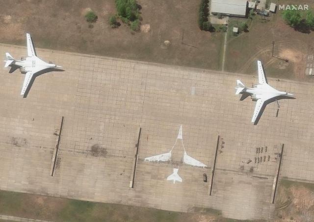 2025년 5월 20일, 맥사 테크놀로지스(Maxar Technologies) 제공의 이 위성 사진에는 러시아 이르쿠츠크주 우솔스키 지구의 벨라야 공군기지에 배치된 투폴레프 Tu-160 폭격기들과 활주로에 그려진 모형 기체(디코이)가 보인다.[사진=AFP·연합뉴스] |