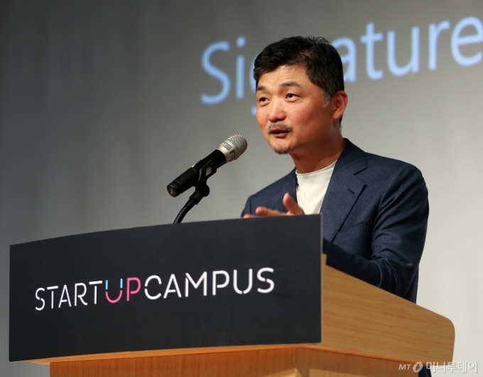 지난 2016년 판교 스타트업캠퍼스 1층 컨퍼런스홀에서 열린 ‘스타트업캠퍼스 창업교육 입학식’에서 김범수 스타트업캠퍼스 총장이 환영사를 하고 있다/사진제공=카카오 |