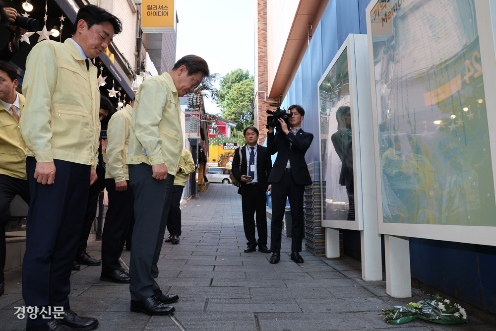 이 대통령은 한강홍수통제소 현장 점검 후 10·29 이태원 참사 현장인 서울지하철 6호선 이태원역 1번 출구 인근 골목을 방문했다. 차량에서 내린 이 대통령은 바닥에 새겨진 ‘우리에겐 아직 기억해야 할 이름들이 있습니다’라는 문구를 살펴본 뒤 국화를 헌화하며 10여초간 눈을 감고 묵념했다. ‘기억과 안전의 길’로 이름 붙은 참사 현장 골목을 찬찬히 둘러본 이 대통령은 동행한 참모진에게 “이곳이 사람들이 밀집했던 곳이냐” “유족 분향소가 여전히 있느냐”고 물었다.