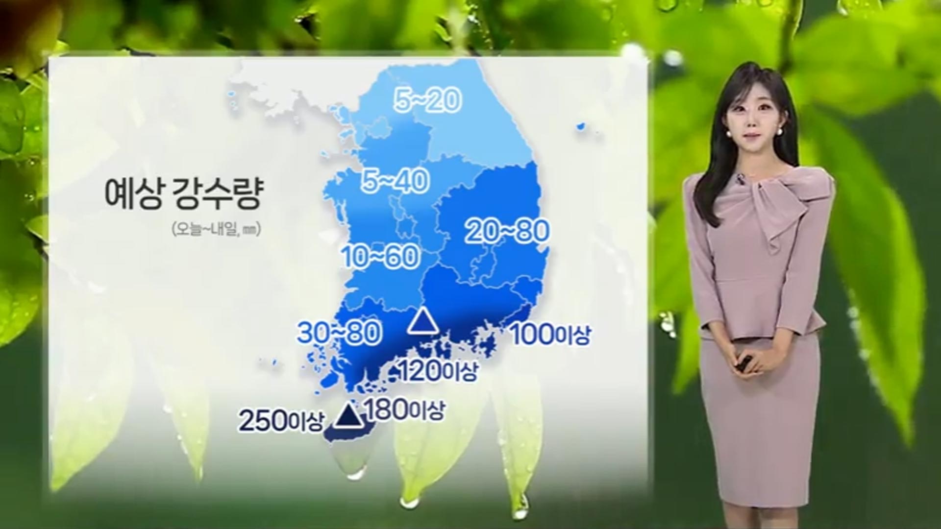 제주에는 최대 250mm의 호우가 내리겠고. 남해안에 120mm 이상, 남부 지방은 최대 80mm, 중부 지방은 60mm 안팎이 예상됩니다.