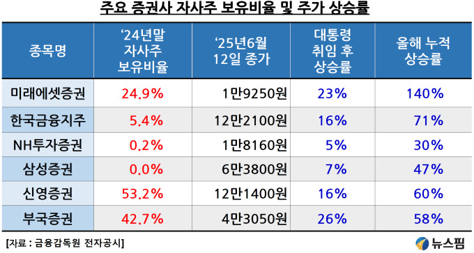 대형 증권사 중 자사주 비중이 24.9%로 가장 높은 미래에셋증권은 이재명 정부 출범 후 6일 동안 23% 폭등했다. 올해 누적 상승률은 무려 140%에 달한다. 5.4%의 자사주를 보유한 한국금융지주도 6일간 16% 상승하는 양호한 모습을 보였다.