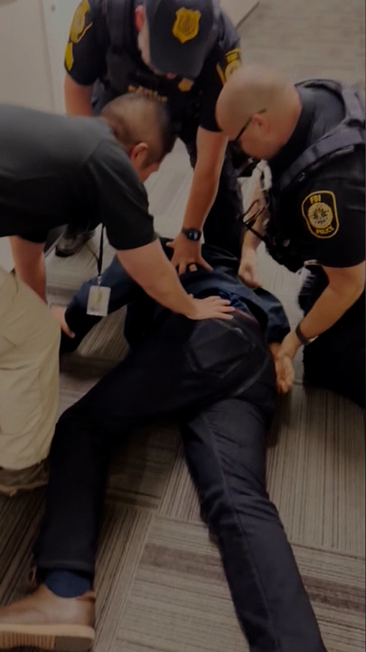 이때 노엄 장관이 있는 단상 쪽으로 다가가려는 파디야 의원을 현장 경호요원 서너 명이 문밖으로 강제로 밀어냈다. 파디야 의원은 “손을 떼라”며 저항했지만 완력에 밀렸다. 이후 회견장 바깥에서 경찰이 파디야 의원을 바닥에 눕히고 손을 등 뒤로 한 상태에서 수갑을 채웠다.