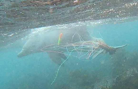 올해 5월 14일 핫핑크돌핀스가 수중에서 촬영한 마지막 종달이의 모습. 몸에 추가로 감긴 낚싯줄에도 찌와 함께 생미끼로 쓰인 넙치가 매달려 있다. 핫핑크돌핀스 제공 |