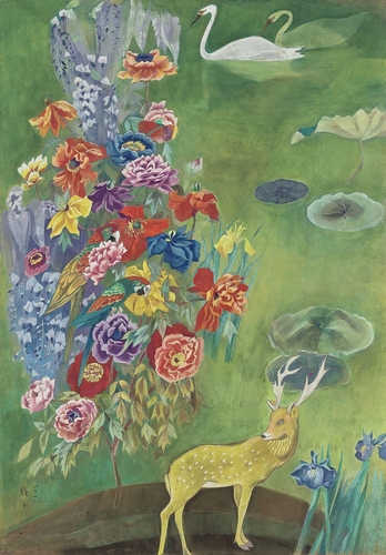 천경자의 1978년작 '윤삼월'은 꽃과 사슴, 백조, 새 등 작가 작품에 자주 등장하는 소재들이 환상적인 분위기의 화면에 함께 그려진 작품이다. 추정가는 8억5천만∼12억원이다.