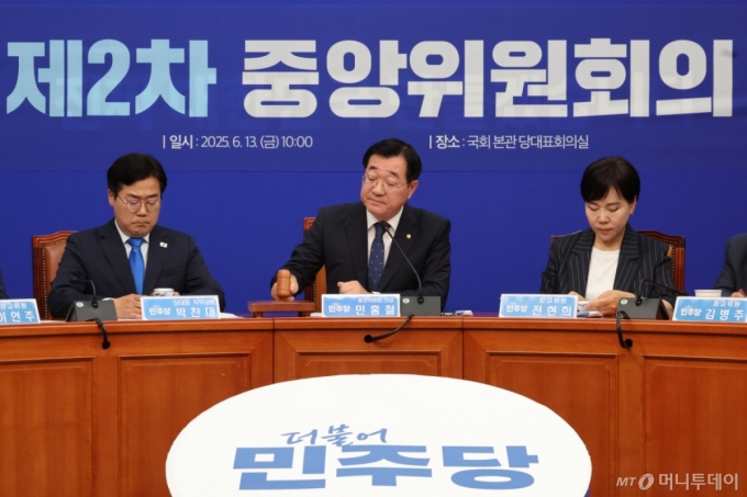 민홍철 더불어민주당 중앙위원회 의장이 13일 오전 서울 여의도 국회에서 열린 제2차 중앙위원회의에서 의사봉을 두드리고 있다./사진=뉴시스 |