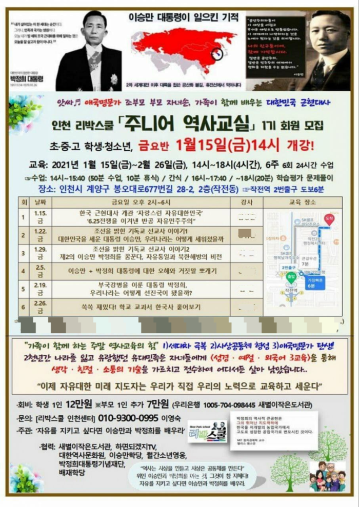 이어 “민주당이 제기한 인천 리박스쿨 ‘주니어 역사교실’ 은 학교가 아닌 민간 차원에서 진행된 것”이라고 덧붙였다.