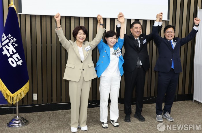 [서울=뉴스핌] 김학선 기자 = 13일 국회에서 열린 더불어민주당 제2기 원내대표 선출 의원총회에서 박찬대 당대표 직무대행(오른쪽부터), 김병기 의원, 서영교 의원, 한정애 선관위원장이 기념촬영을 하고 있다. 2025.06.13 yooksa@newspim.com