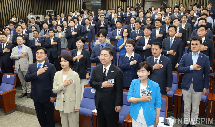 [서울=뉴스핌] 김학선 기자 = 13일 국회에서 열린 더불어민주당 제2기 원내대표 선출 의원총회에서 박찬대 당대표 직무대행(앞줄 왼쪽부터), 한정애 선관위원장, 김병기·서영교 후보를 비롯해 의원들이 국민의례를 하고 있다. 2025.06.13 yooksa@newspim.com