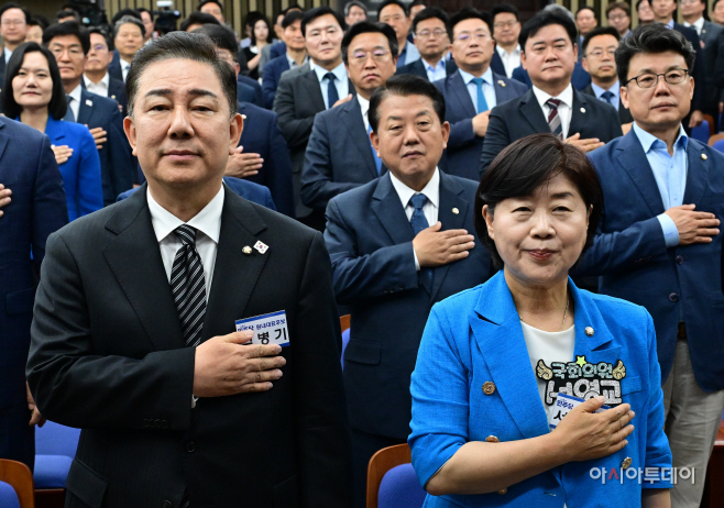 김병기-서영교 더불어민주당 원내대표 후보가 13일 국회에서 열린 더불어민주당 제2기 원내대표 선출 의원총회에서 국민의례를 하고 있다. /이병화 기자 |