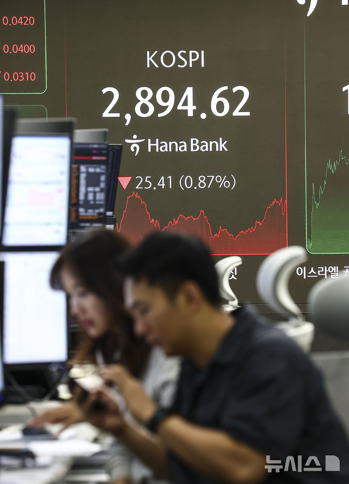 [서울=뉴시스] 김근수 기자 = 코스피가 전 거래일(2920.03)보다 25.41포인트(0.87%) 떨어진 2894.62에 장을 마친 13일 서울 중구 하나은행 본점 딜링룸 전광판에 지수가 나오고 있다. 코스닥 지수는 전 거래일(789.45)보다 20.59포인트(2.61%) 내린 768.86에 거래를 종료했다. 외환시장에서 원·달러 환율은 전 거래일 주간거래 종가(1358.7원)보다 10.9원 오른 1369.6원에 주간 거래를 마감했다. 2025.06.13. ks@newsis.com |