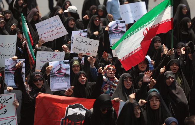 이란 여성들이 13일(현지시간) 이란 테헤란에서 이스라엘의 공습에 반대하는 시위에 참여하고 있다./EPA 연합 |