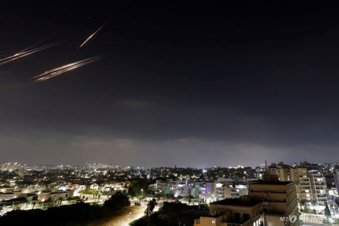 13일(현지시간) 이스라엘 아슈켈론시에서 바라본 상공에 이란에서 발사된 미사일을 요격하는 섬광이 보이고 있다. /로이터=뉴스1 |