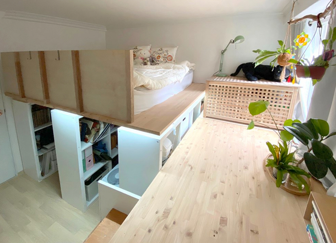 프리랜서에게 집은 곧 사무실이자 창고이자 휴게실이어서, 각각의 기능을 효율적으로 사용할 방법을 고민해야 한다. 함께 사는 친구는 그림을 그리는 작가이기에 그에게는 책상뿐 아니라 각종 미술 재료와 종이, 스케치북을 보관할 공간이 필요하다. 한편, 나는 수리에 쓰는 공구와 자재를 쌓아두고 있다. 그래서 우리 집에는 반드시 창고가 필요하다. 그런데 집이 좁고 방이 두 개뿐이라면 어떡할까? 고민 끝에 침대를 공중으로 올리고 아래에 수납공간이 있는 벙커 침대를 만들었다. 덕분에 안방에는 56칸짜리 창고가 생겼고, 다른 방 침대 밑에는 사계절 옷을 보관하는 옷장이 놓였다. 그중 한 칸은 회전하는 옷장으로 만들어서 자주 입는 옷을 한눈에 보고 고를 수 있다.