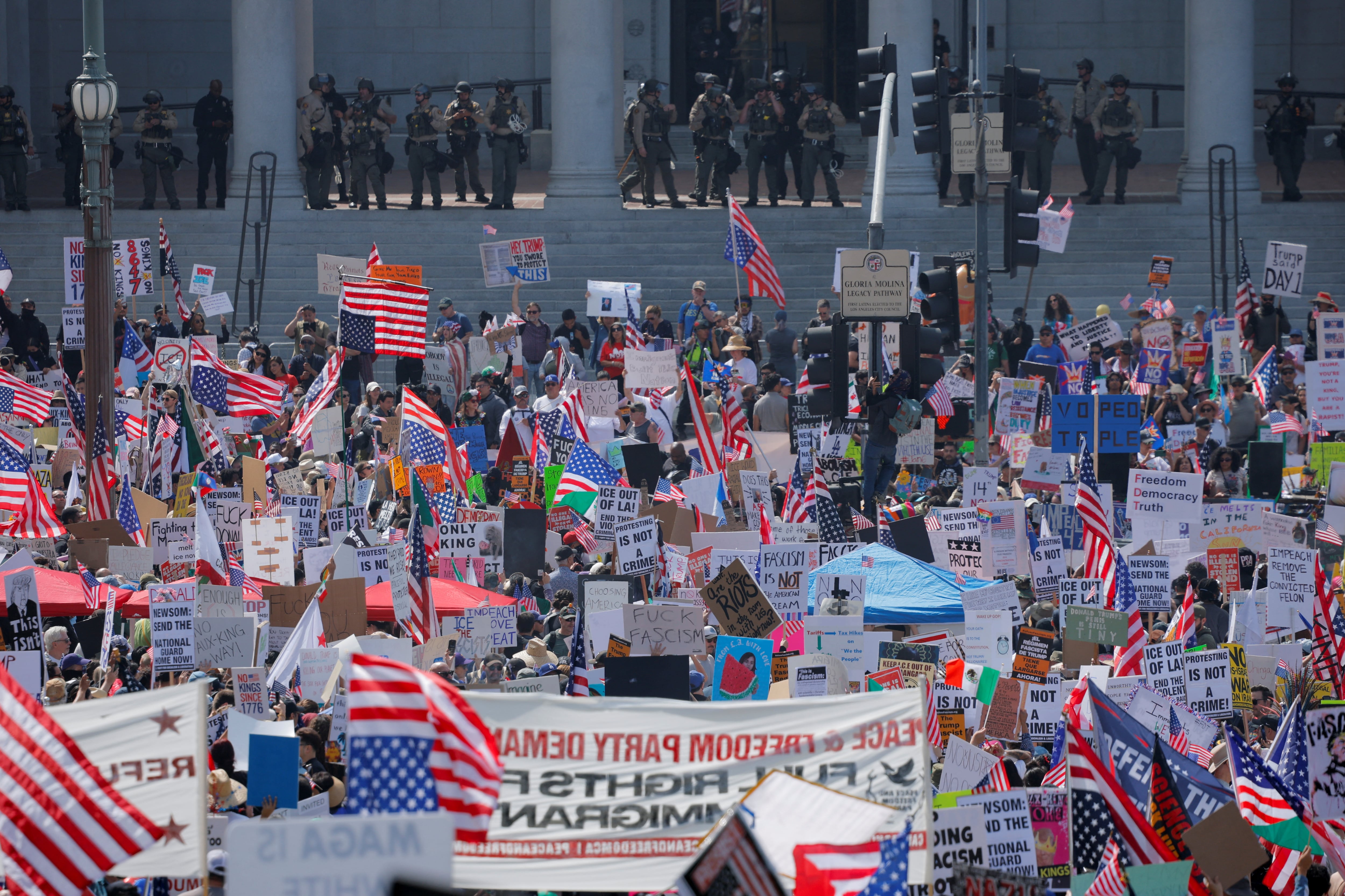 14일 미 캘리포니아주 로스앤젤레스 시청 앞에서 도널드 트럼프 대통령의 정책에 반대하는 시민들이 대규모 시위를 벌이고 있다. /로이터 연합뉴스 |