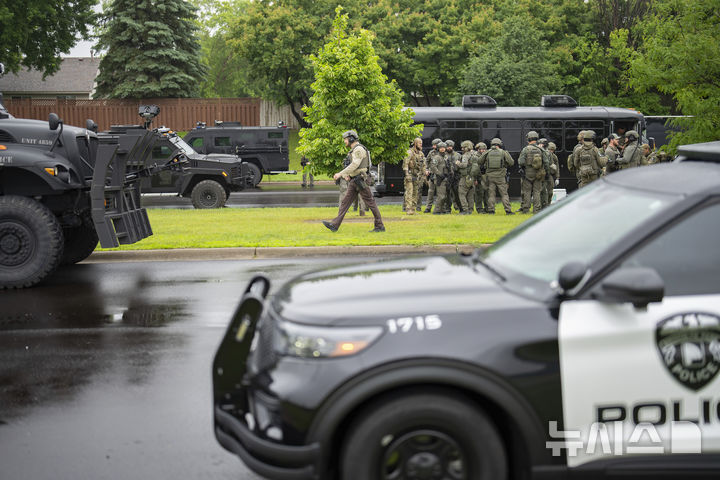 [브루클린파크(미 미네소타주)=AP/뉴시스] 14일 주의회 상하원 의원들에 대한 총격 사건이 발생한 미네소타주 브루클린파크에서 경찰 등이 출동해 있다. 2025.06.15. |