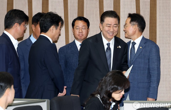 [서울=뉴스핌] 정일구 기자 = 김병기 더불어민주당 대표 직무대행 겸 원내대표가 15일 오전 서울 여의도 국회에서 원내대표단 인선 발표를 위해 소통관 기자회견장에 들어서고 있다. 2025.06.15 mironj19@newspim.com