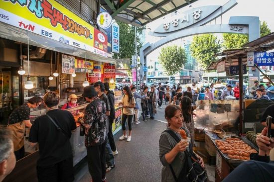 서울 종로구 광장시장에 자리한 유명 꽈배기 상점을 찾은 외국인 관광객들이 꽈배기를 구입하기 위해 줄을 서고 있다. |