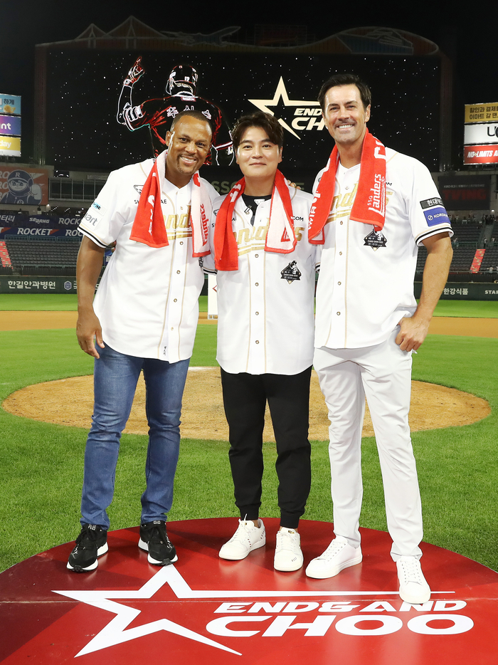 14일 인천SSG랜더스필드에서 열린 추신수 보좌역 은퇴식에서 메이저리그(ML) 전설 아드리안 벨트레(왼쪽), 콜 해멀스(오른쪽)가 추신수 보좌역과 나란히 섰다. 사진 | SSG 랜더스 |