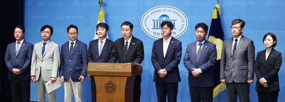 김병기 더불어민주당 신임 원내대표가 15일 오전 서울 여의도 국회 소통관에서 원내대표단 인선발표를 하고 있다. 왼쪽부터 문금주·김현정 대변인, 허영 정책수석, 문진석 운영수석, 김 원내대표, 박상혁 소통수석, 이기헌 비서실장, 김남근 민생부대표, 백승아 대변인. 뉴스1 |