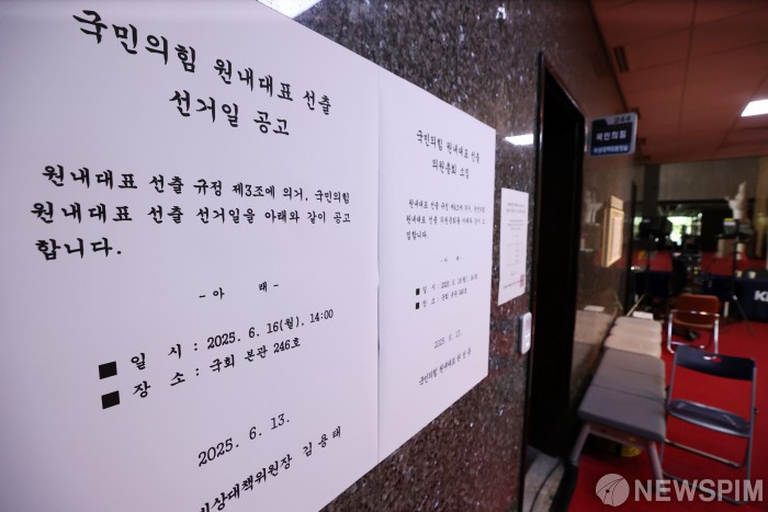 [서울=뉴스핌] 정일구 기자 = 국민의힘 차기 원내대표 선출을 하루 앞둔 15일 오후 서울 여의도 국회에 원내대표 선출 관련 공고문이 붙어 있다. 원내대표 경선에는 송언석, 이헌승, 김성원 의원(기호순)이 출마했다. 2025.06.15 mironj19@newspim.com