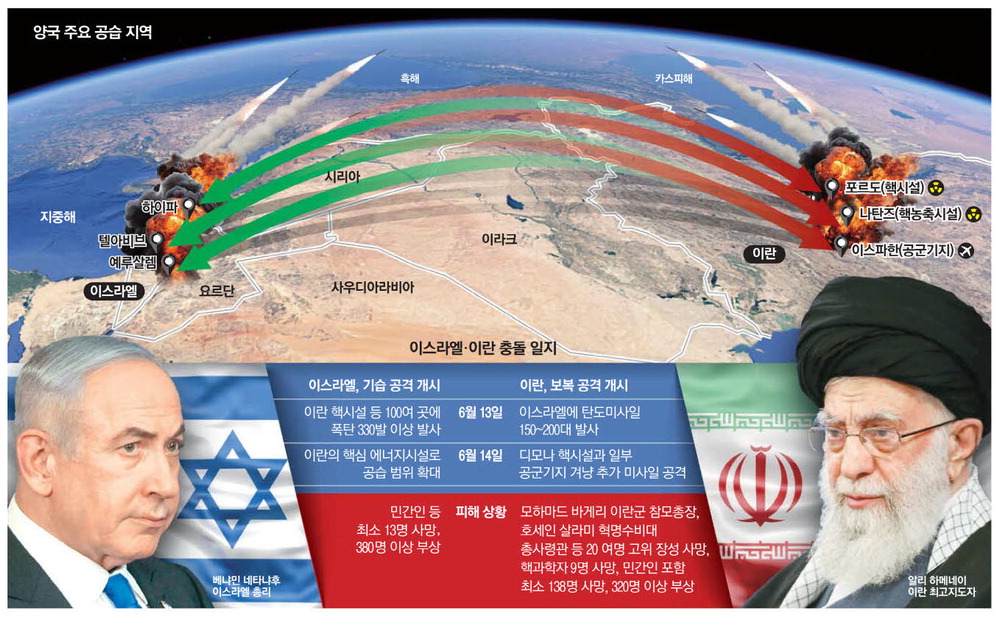이스라엘과 이란이 정면충돌했다. 이스라엘의 이란 핵시설, 군부 핵심 등에 대한 선제 타격과 이란의 미사일 보복 세례가 맞물리며 중동 정세가 걷잡을 수 없는 소용돌이로 빠지고 있다. 미국의 중재 실패 등 복합적 변수 속에서 이번 사태가 어디까지 확산될지 세계가 숨죽여 지켜보는 가운데 주요 외신들이 제기한 이번 사태의 원인과 전망을 5대 궁금증으로 정리했다.