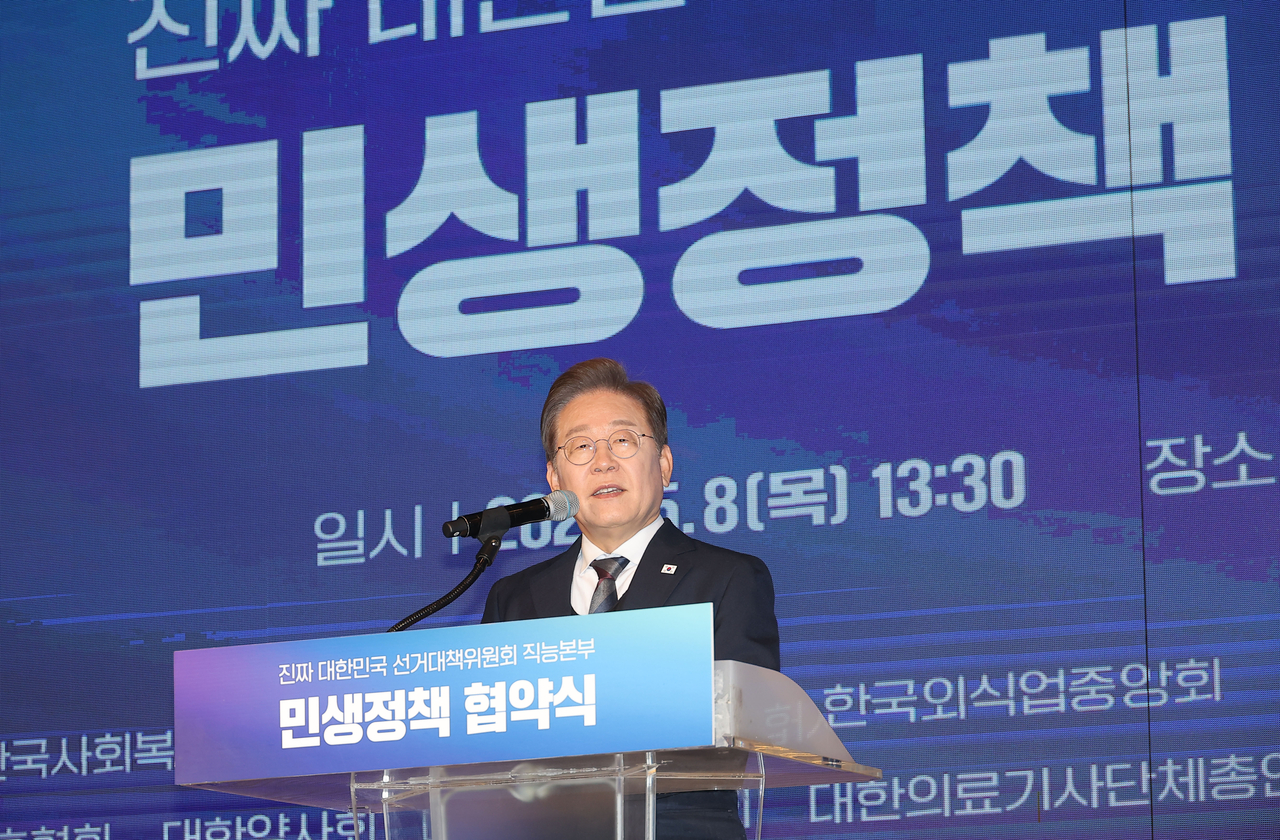 이재명 더불어민주당 대선 후보가 8일 서울 여의도 중소기업중앙회에서 열린 ‘진짜 대한민국 선거대책위원회’ 직능본부 민생정책 협약식에서 발언하고 있다. [연합뉴스] |