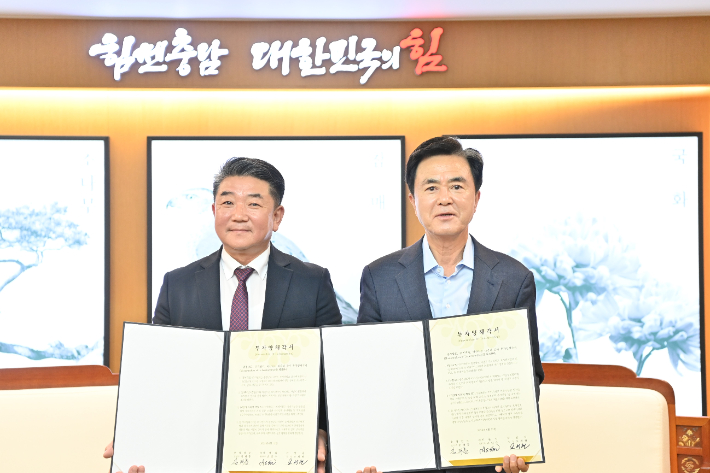 김태흠 충남지사(오른쪽)와 손일수 지앤티 대표가 투자양해각서에 서명한 뒤 기념촬영을 하고 있다. 충남도 제공 |
