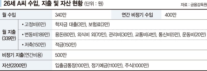 A. 26세 A씨 월 수입은 340만원이다. 연간 비정기 수입은 400만원이 들어온다. 월 지출은 339만원이다. 고정비가 학자금 대출(3만원), 보험료(3만원) 등 6만원이다. 변동비는 용돈(60만원), 외식비 외(70만원), 관리비(30만원), 교통비(4만원), 통신비(5만원), 운동비(20만원) 등을 합쳐 189만원이다. 저축은 적금 150만원씩 하고 있다. 연간 비용은 500만원이다. 자산은 입출금통장(100만원), 정기예금(1100만원), 주식(1000만원) 등 2200만원이다. 부채로는 학자금 대출 300만원이 있다.