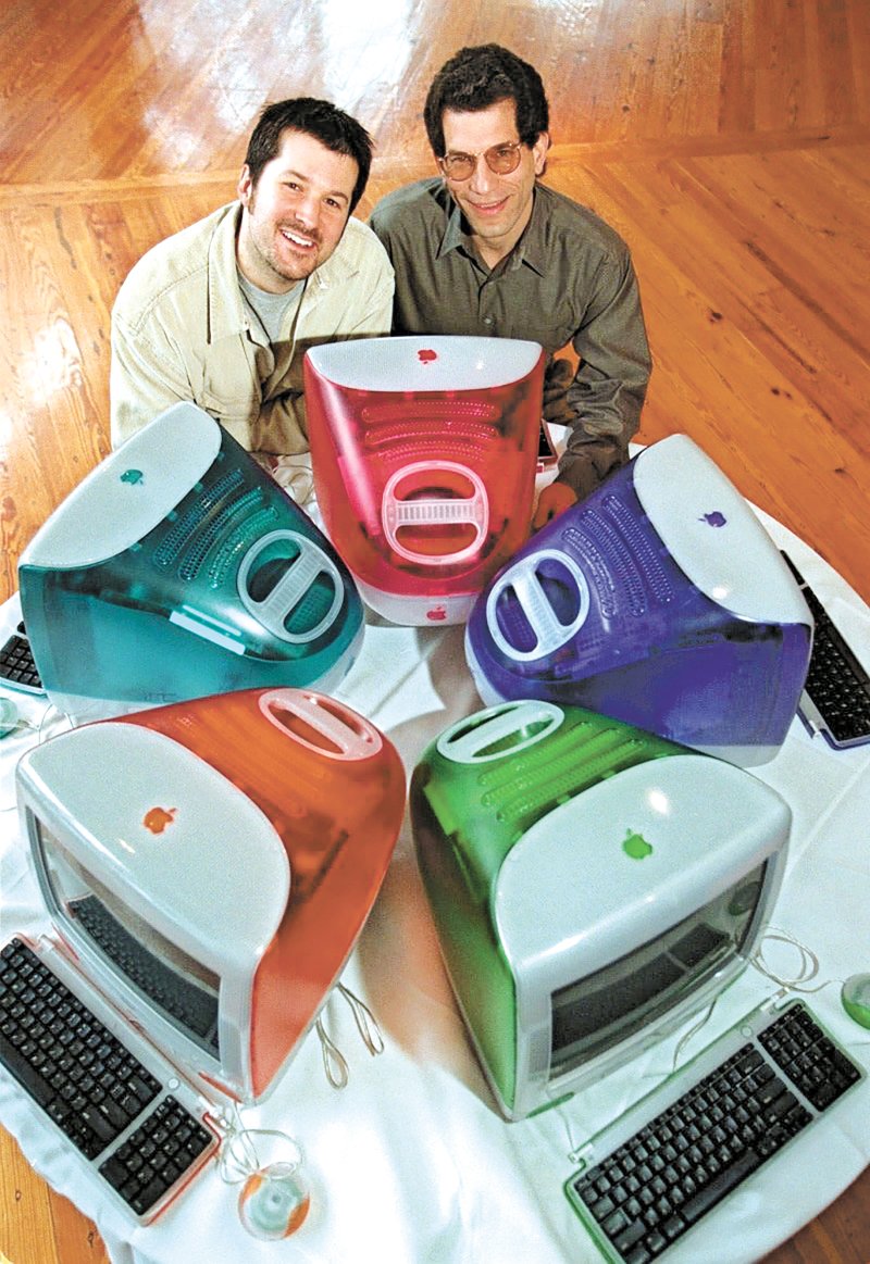 지난 1999년 조니 아이브(왼쪽) 애플 디자인 이사와 존 루빈스타인 애플 엔지니어링 이사가 미국 캘리포니아주 쿠퍼티노의 애플 본사에서 아이맥 컴퓨터를 앞에 놓고 포즈를 취하고 있다. AP뉴시스 |