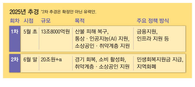 정부가 조만간 2025년도 제2차 추가경정예산안을 발표할 예정이다. 내수 진작과 경기 회복을 목표로 최소 20조원 규모로 편성될 전망이며, 민생회복지원금과 지역사랑상품권(지역화폐) 지원책 등이 포함될 가능성이 제기된다.