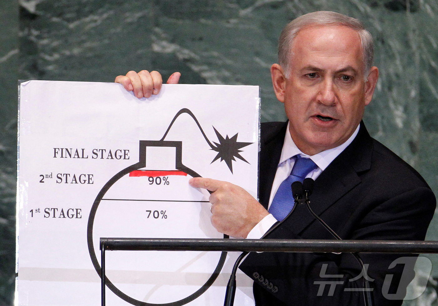 베냐민 네타냐후 이스라엘 총리가 2012년 9월 27일 유엔 총회에서 이란 핵프로그램 문제를 제기하고 있다. 2012.09.27. ⓒ 로이터=뉴스1 |