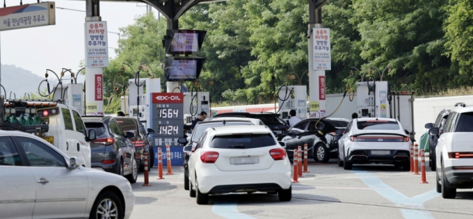 전국 주유소 기름값 평균 가격이 5주 연속 하락한 가운데 15일 서울 서초구 만남의광장 셀프주유소에서 시민들이 주유를 하기 위해 줄을 서고 있다. 중동 지역 긴장 격화 등으로 국제유가가 급등한 가운데 시차를 두고 국내유가에 반영될 전망이다. [서울=뉴시스] |