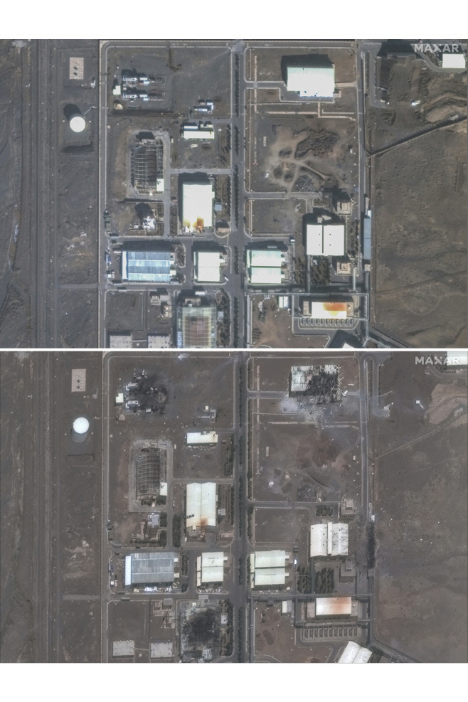 2025년 1월 24일(현지시간) 이란 테헤란에서 남동쪽으로 135마일(217km) 떨어진 나탄즈의 우라늄 농축 시설(위)과 13일 이스라엘의 공습으로 여러 건물이 파괴된 후인 14일의 모습으로 미국 민간 위성업체 맥사 테크놀로지가 찍은 사진./AP·연합 |